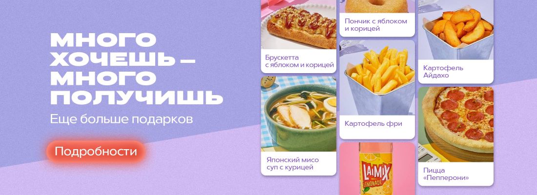 • В акции участвуют следующие подарочные позиции: Салат с фунчозой и курицей, Картофель фри, Пончик с яблоком и корицей, Лимонад Лаймикс 1,5 л.