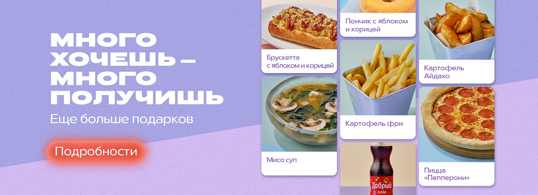 • В акции участвуют следующие подарочные позиции: Салат с фунчозой и курицей, Картофель фри, Пончик с яблоком и корицей, Добрый кола 1 л.